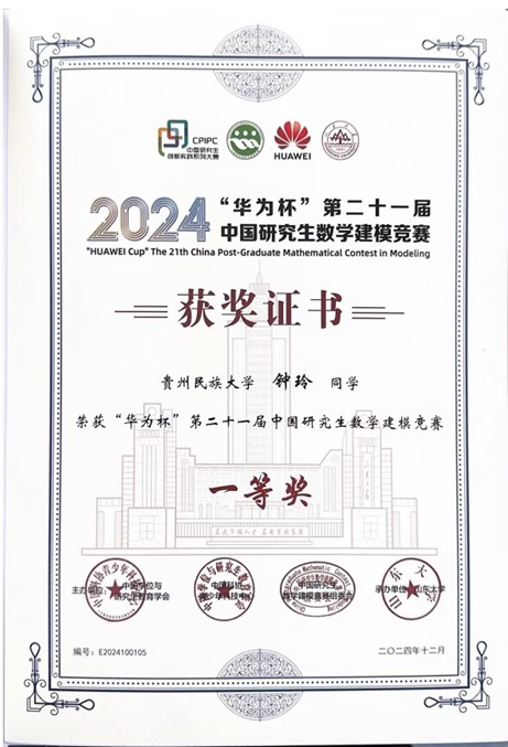 在皇冠登陆入口welcome 2024年“华为杯 第二十一届中国研究生数学建模竞赛”中,由皇冠登陆入口welcome蔡静老师指导的由钟玲、罗树霞、林勉三位同学组成的团队,在大赛中表现优秀,荣获国家级一等奖,为学校争得荣誉,充分展现了皇冠登陆入口welcome数信皇冠登陆入口welcome学子风采,此外,本次大赛皇冠登陆入口welcome还获得了5项国家级三等奖的优异成绩。据悉,此次共有来自国际和全国各省、自治区、直辖市、特别行政区共521个研究生培养单位的20247名研究生(含国际赛道)参赛。